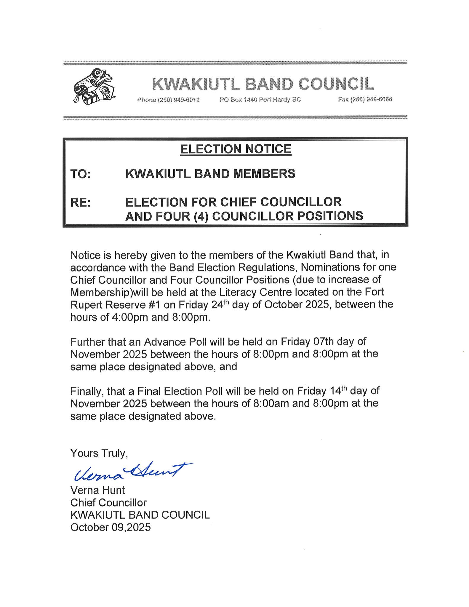 Kwakiutl Election Notice – For Chief and Four (4) Councillors